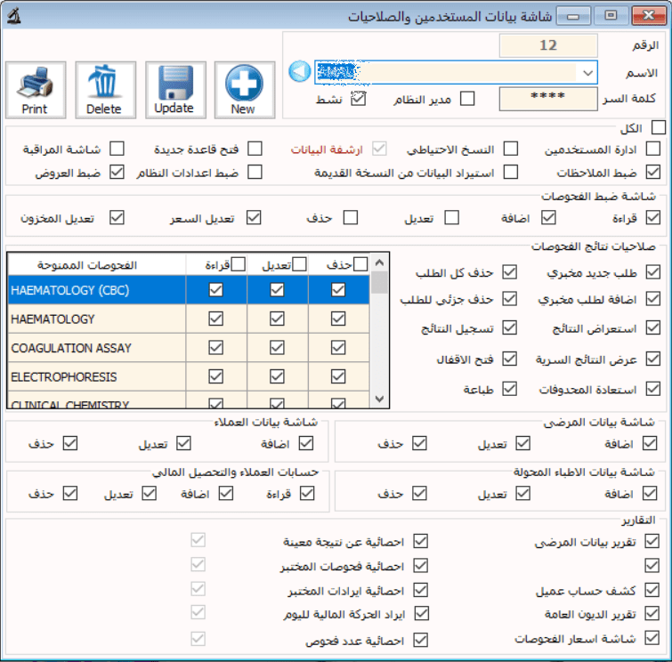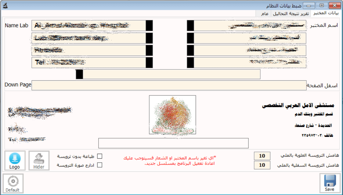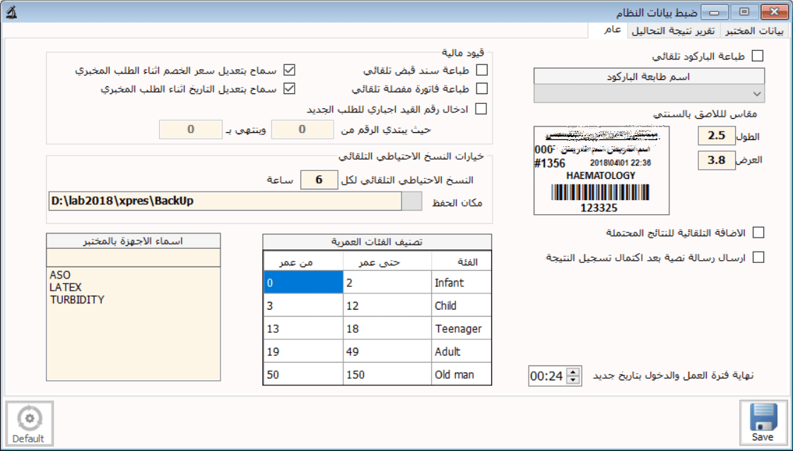 لوحة تحكم متعددة الخيارات للتحكم بجميع عمليات النظام وضبط بيانات النظام والتعديل على اللون والاسم والموضع , وتنسيق طباعة الباركود , والتحكم بشكل تقرير نتائج الفحوصات بشكل كبير