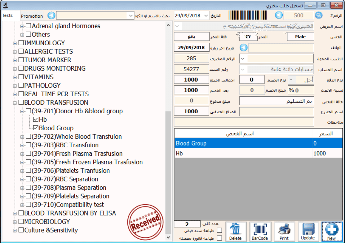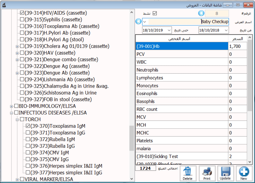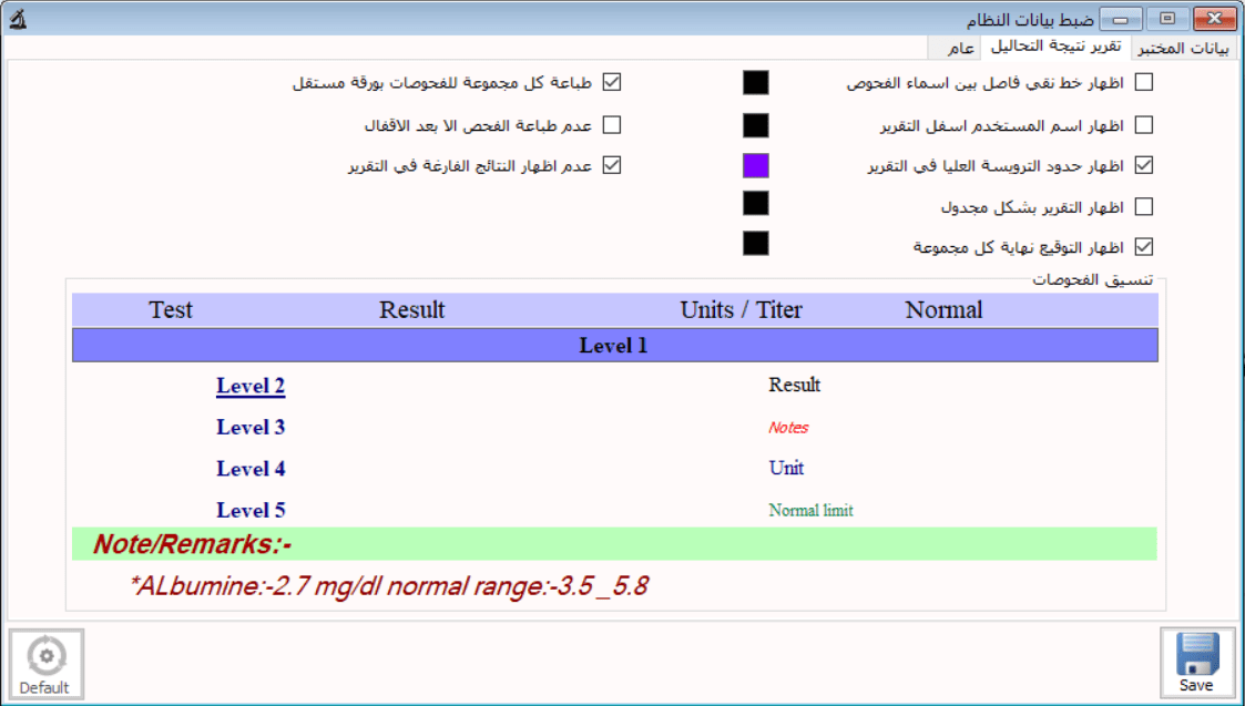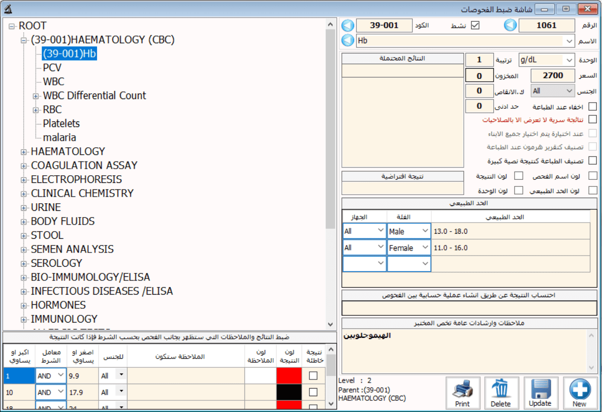 إمكانية تصنيف شجرة الفحوصات بعدد لا محدود مع إدراج لكل فحص (النتائج المحتملة , النتيجة الافتراضية , الحد الطبيعي , الوحدة , معادلة احتساب نتيجة الفحص , الملاحظات التلقائية , الجنس , نوع جهاز المختبر)