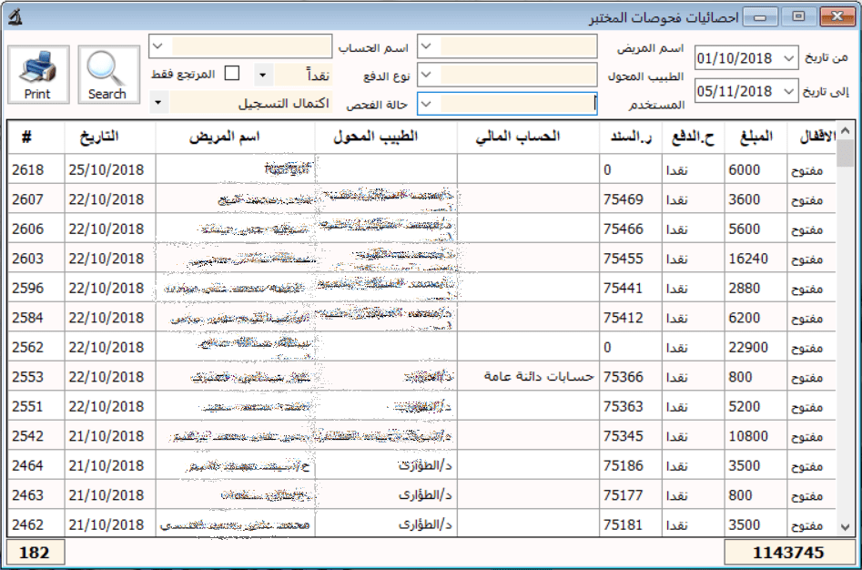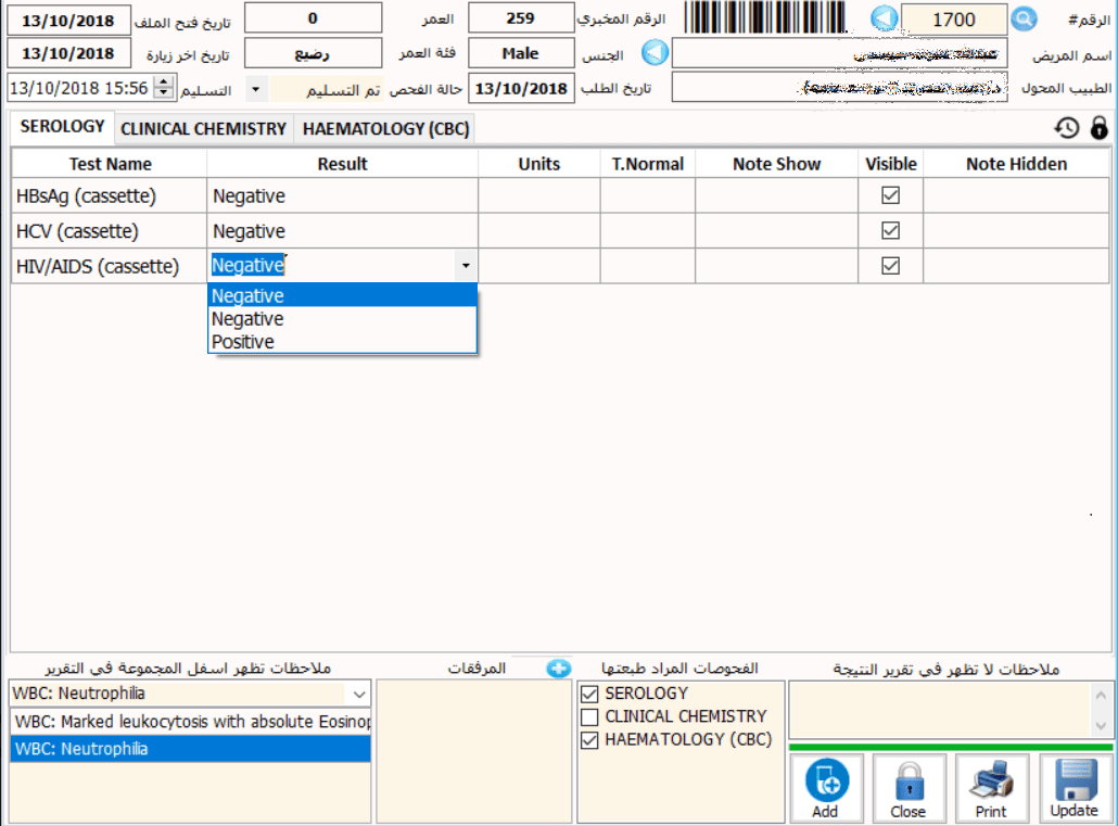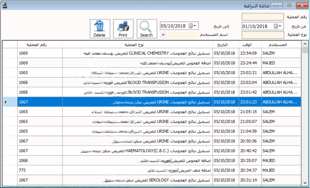 إمكانية إقفال الفحوصات على مستوى المستخدم أو على مستوى نوع الفحص أو على المستوى الكلي, بحيث عدم التعديل عليها وإمكانية عدم طباعتها إلا بعد الإقفال. وتوجد خمس حالات للفحص مرحلة (أخذ العينة – تسجيل النتائج –اكتمال التسجيل – قيد التسليم - تم التسليم).